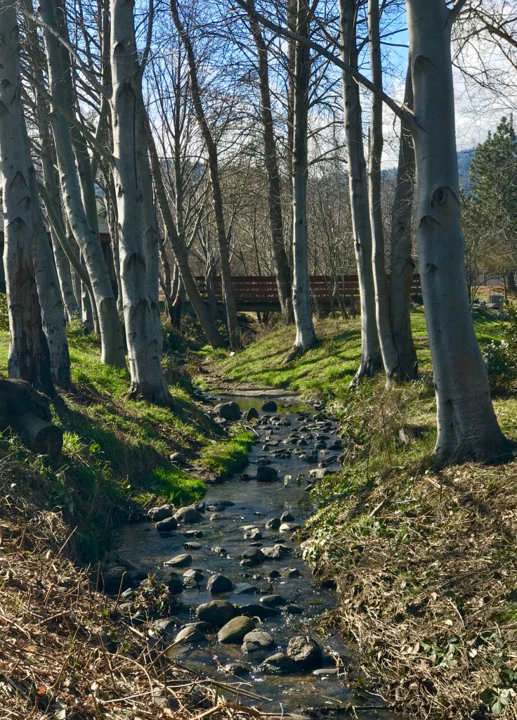 Late winter sun shines through bare trees, turning the creek banks a bright spring green.