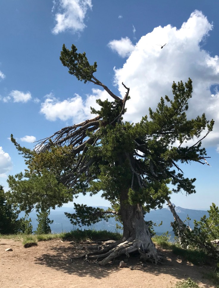 Growing at an elevation of 8,000 feet, a gnarled and weathered tree clings to a patch of land 2,000 feet above Crater Lake. Silhouetted against the cloud is a dragonfly…they were everywhere!