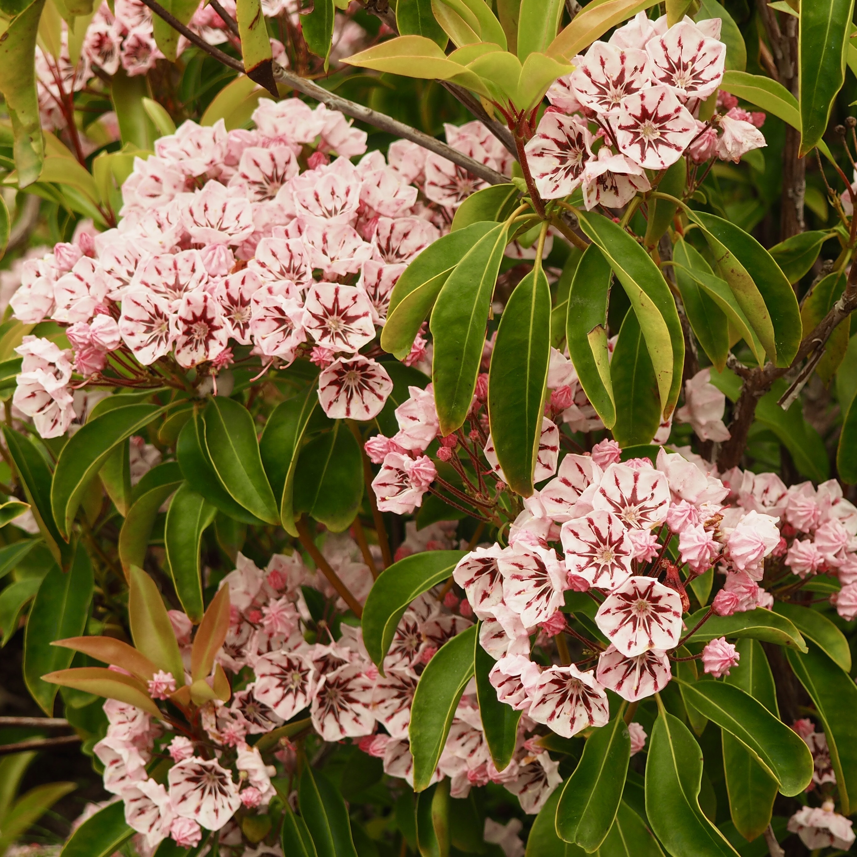 Mountain Laurels bloom with flowers that look like peppermint candy in the gardens of Oregon’s Shore Acres State Park.