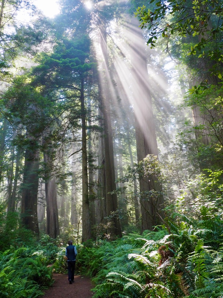 As the fog lifts, sunbeams filter through California’s Coastal Redwoods.
