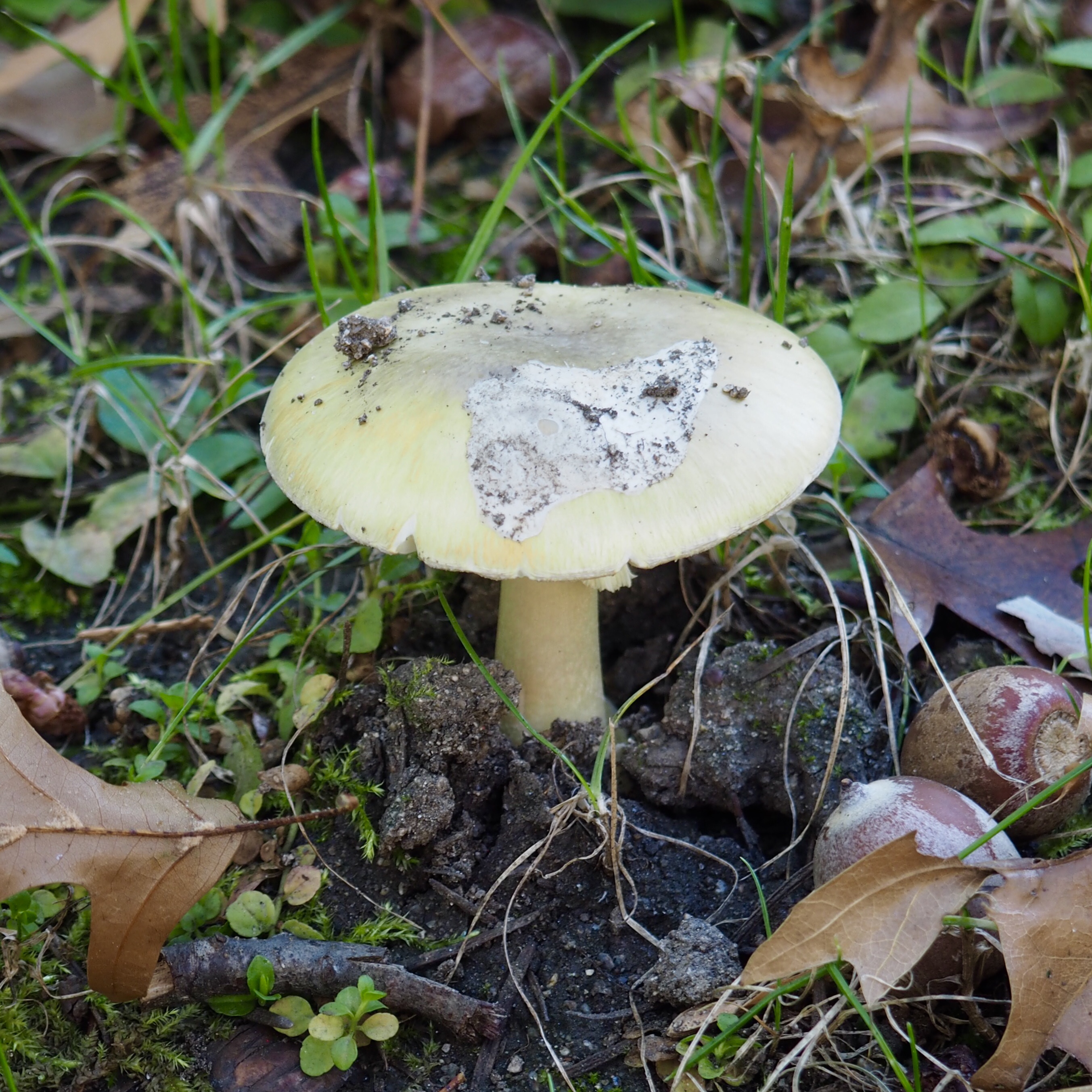 Springing up from below the trees, one lone mushroom grows undisturbed.