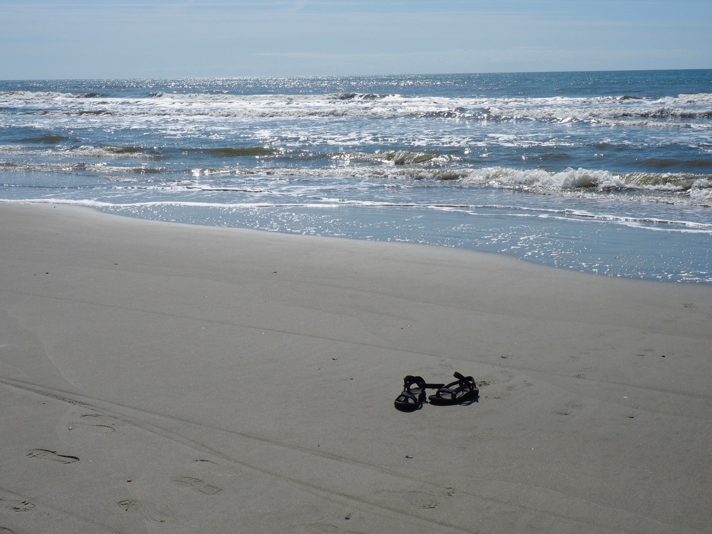 White sands and warm waters off the coast of South Carolina. This is no place for shoes!